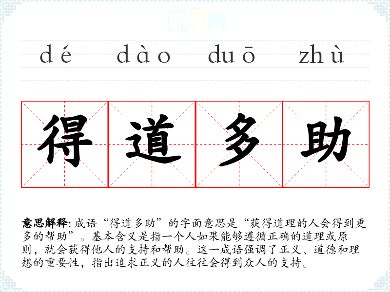 | 得道多助 | 指符合道义者则能得到多数人的帮助。 |