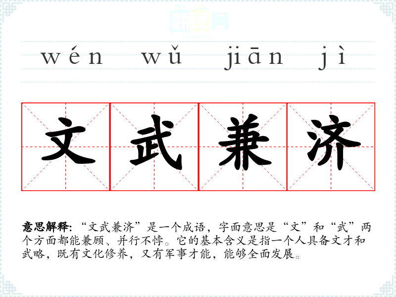 “文武兼济”是一个成语,字面意思是“文”和“武”两个方面都能兼顾、并行不悖。它的基本含义是指一个人具备文才和武略,既有文化修养,又有军事才能,能够全面发展。