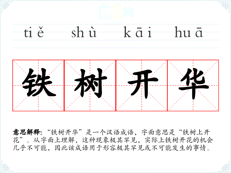 “铁树开华”是一个汉语成语,字面意思是“铁树上开花”。从字面上理解,这种现象极其罕见,实际上铁树开花的机会几乎不可能,因此该成语用于形容极其罕见或不可能发生的事情。