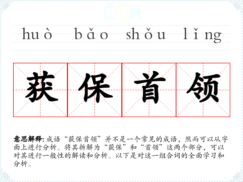 字面上,“获保”可以理解为“获得保护”,“首领”则是指领导者或首位人物。因此,“获保首领”可以理解为“获得保护的领导者”,暗示某个领导者在某种程度上得到了保护或支持。
