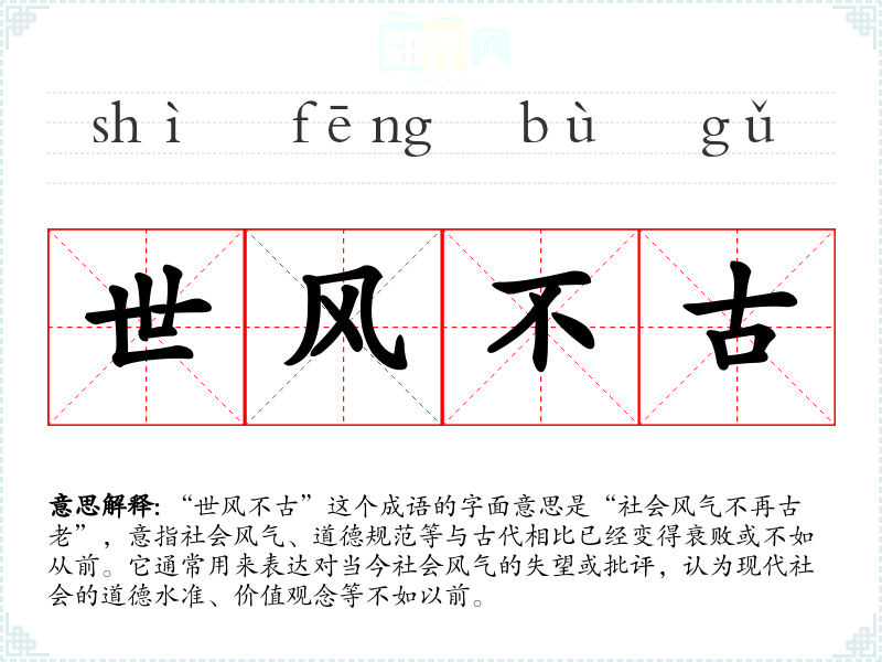 “世风不古”这个成语的字面意思是“社会风气不再古老”,意指社会风气、道德规范等与古代相比已经变得衰败或不如从前。它通常用来表达对当今社会风气的失望或批评,认为现代社会的道德水准、价值观念等不如以前。