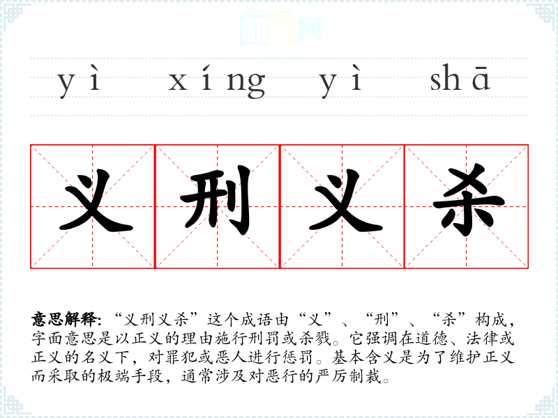 “义刑义杀”这个成语由“义”、“刑”、“杀”构成,字面意思是以正义的理由施行刑罚或杀戮。它强调在道德、法律或正义的名义下,对罪犯或恶人进行惩罚。基本含义是为了维护正义而采取的极端手段,通常涉及对恶行的严厉制裁。