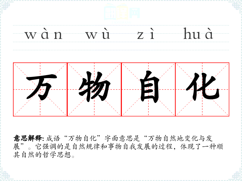 成语“万物自化”字面意思是“万物自然地变化与发展”。它强调的是自然规律和事物自我发展的过程,体现了一种顺其自然的哲学思想。