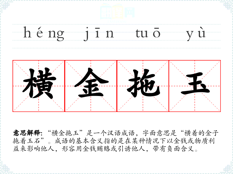 “横金拖玉”是一个汉语成语,字面意思是“横着的金子拖着玉石”。成语的基本含义指的是在某种情况下以金钱或物质利益来影响他人,形容用金钱贿赂或引诱他人,带有负面含义。