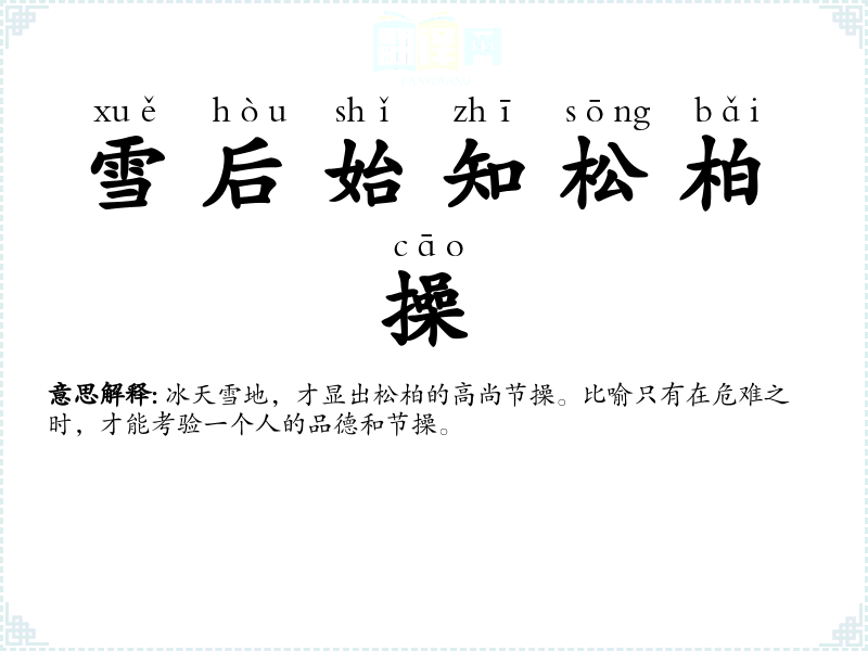 寒冬腊月,方知松柏常青。比喻有志之士在艰险的环境中奋斗到最后。 |