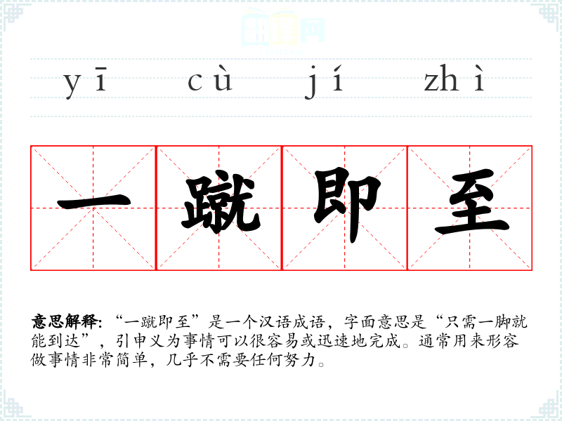 “一蹴即至”是一个汉语成语,字面意思是“只需一脚就能到达”,引申义为事情可以很容易或迅速地完成。通常用来形容做事情非常简单,几乎不需要任何努力。