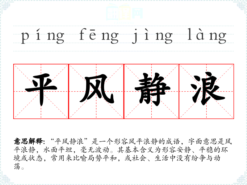 “平风静浪”是一个形容风平浪静的成语,字面意思是风平浪静,水面平坦,毫无波动。其基本含义为形容安静、平稳的环境或状态,常用来比喻局势平和,或社会、生活中没有纷争与动荡。