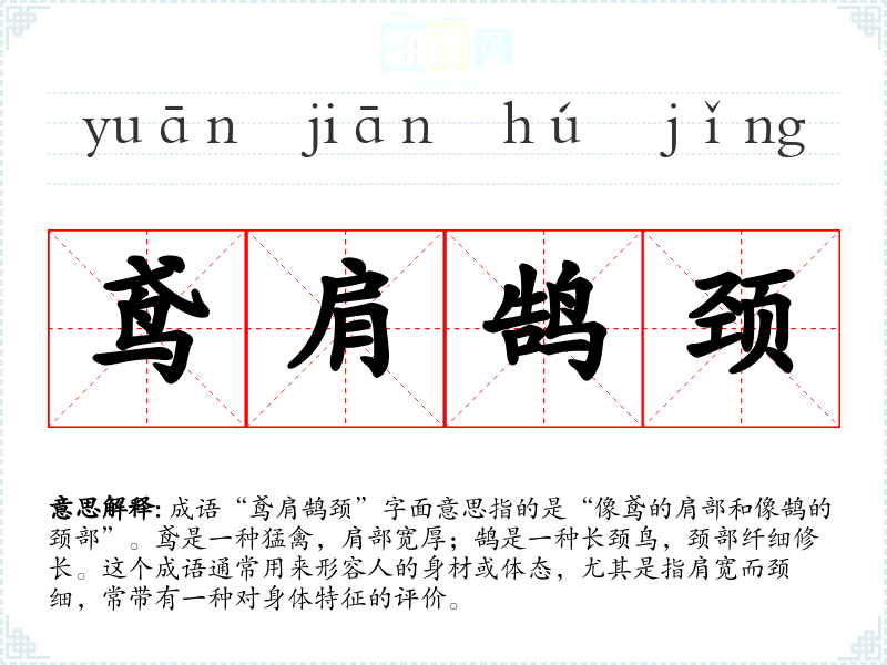 成语“鸢肩鹄颈”字面意思指的是“像鸢的肩部和像鹄的颈部”。鸢是一种猛禽,肩部宽厚;鹄是一种长颈鸟,颈部纤细修长。这个成语通常用来形容人的身材或体态,尤其是指肩宽而颈细,常带有一种对身体特征的评价。