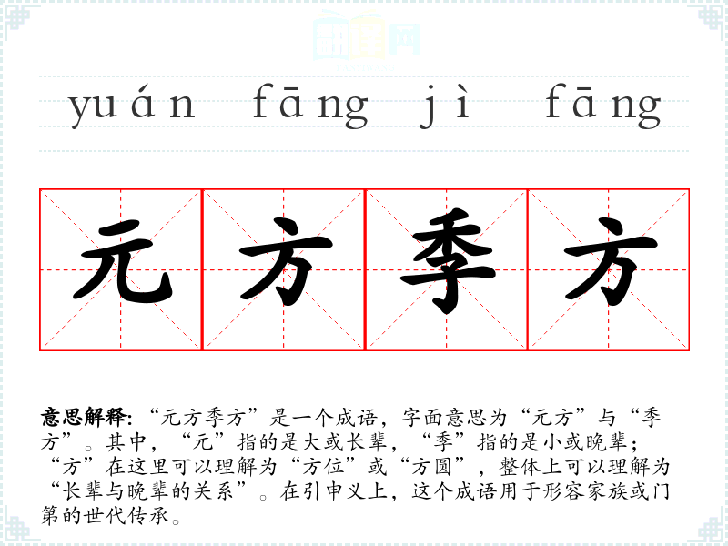 “元方季方”是一个成语,字面意思为“元方”与“季方”。其中,“元”指的是大或长辈,“季”指的是小或晚辈;“方”在这里可以理解为“方位”或“方圆”,整体上可以理解为“长辈与晚辈的关系”。在引申义上,这个成语用于形容家族或门第的世代传承。