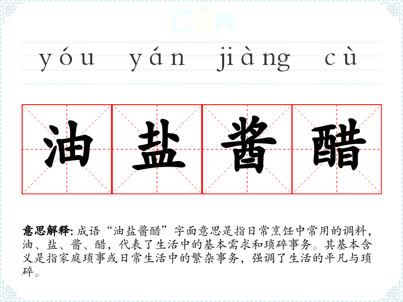 “油盐酱醋”作为成语,起源于的饮食文化,反映了家庭日常生活中的基本调料。虽然并没有明确的历史典故,但它与传统家庭生活密切相关,反映了人们在生活中对于日常饮食的重视。它常用来形容琐事繁多的家庭生活,尤其是婚姻中的琐碎事务。