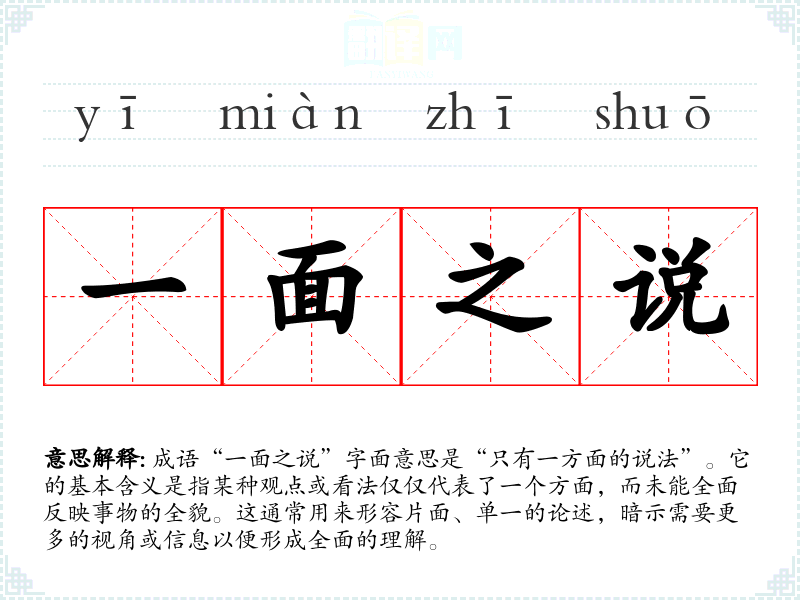 成语“一面之说”字面意思是“只有一方面的说法”。它的基本含义是指某种观点或看法仅仅代表了一个方面,而未能全面反映事物的全貌。这通常用来形容片面、单一的论述,暗示需要更多的视角或信息以便形成全面的理解。