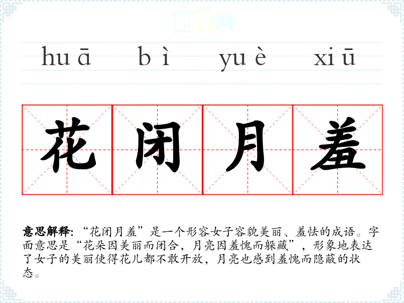 | 月闭花羞 | 闭:躲避;羞:害臊。闭月形容貂禅,羞花形容杨玉环。使月亮见了也躲避起来,花儿见了也自觉羞愧。形容女子貌美。 |