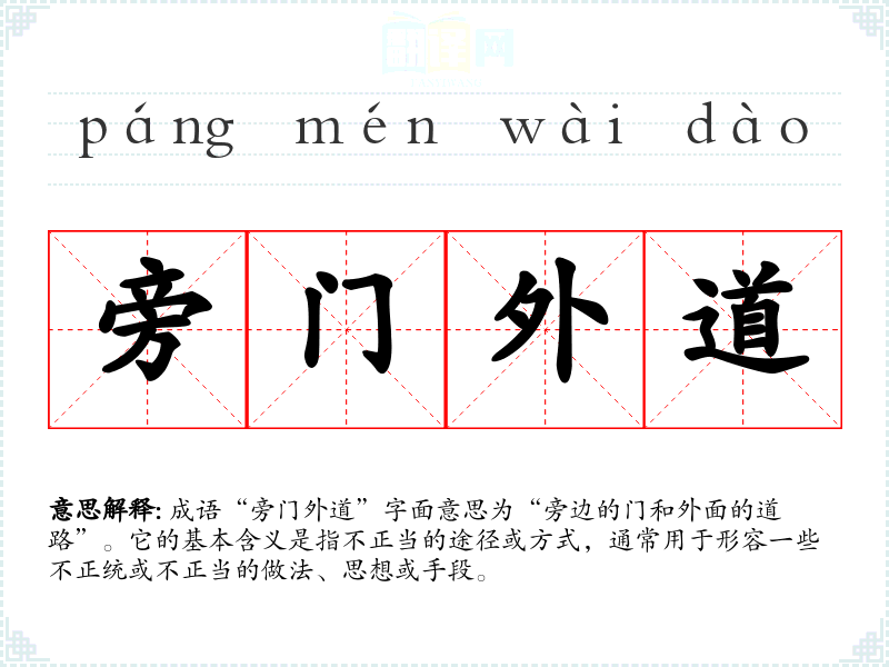 成语“旁门外道”字面意思为“旁边的门和外面的道路”。它的基本含义是指不正当的途径或方式,通常用于形容一些不正统或不正当的做法、思想或手段。