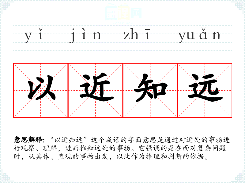 “以近知远”这个成语的字面意思是通过对近处的事物进行观察、理解,进而推知远处的事物。它强调的是在面对复杂问题时,从具体、直观的事物出发,以此作为推理和判断的依据。
