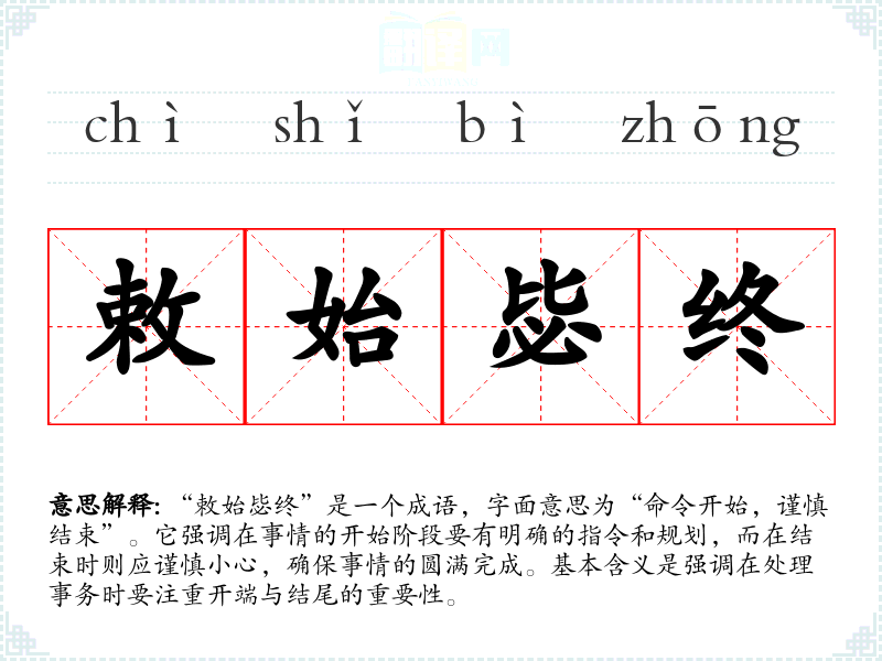 - 在项目启动会中,经理强调:“我们必须牢记‘敕始毖终’,确保每个阶段都按计划推进。”