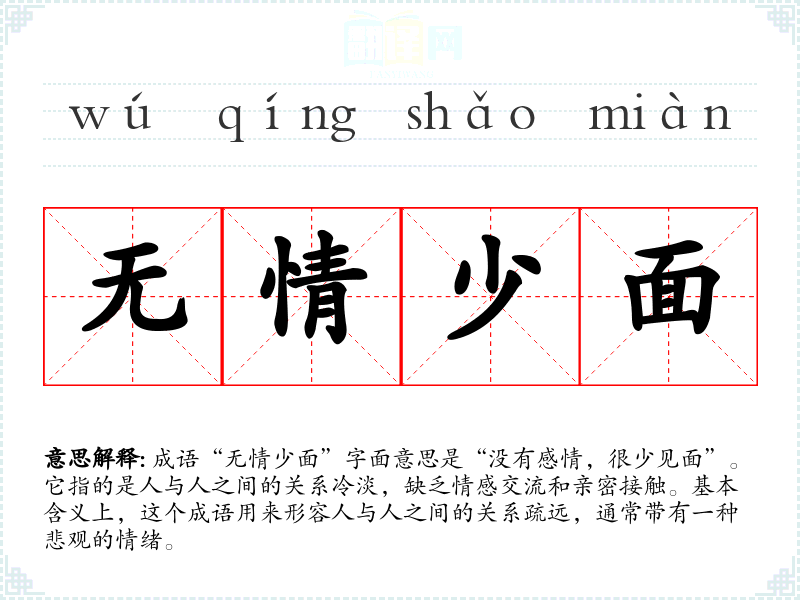 成语“无情少面”字面意思是“没有感情,很少见面”。它指的是人与人之间的关系冷淡,缺乏情感交流和亲密接触。基本含义上,这个成语用来形容人与人之间的关系疏远,通常带有一种悲观的情绪。