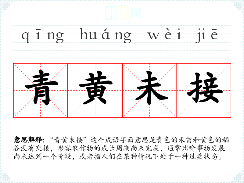 “青黄未接”这个成语字面意思是青色的禾苗和黄色的稻谷没有交接,形容农作物的成长周期尚未完成,通常比喻事物发展尚未达到一个阶段,或者指人们在某种情况下处于一种过渡状态。