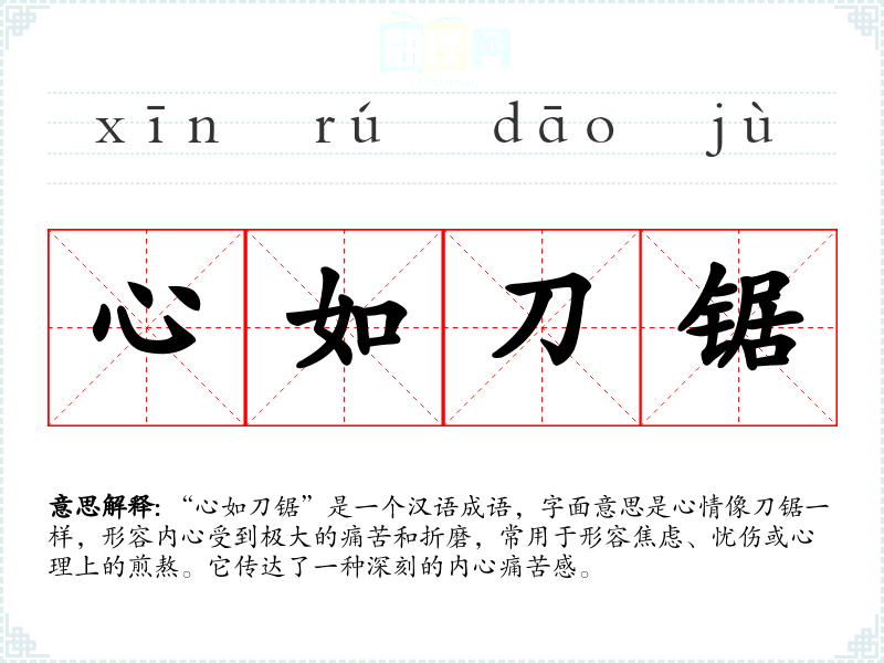 “心如刀锯”是一个汉语成语,字面意思是心情像刀锯一样,形容内心受到极大的痛苦和折磨,常用于形容焦虑、忧伤或心理上的煎熬。它传达了一种深刻的内心痛苦感。