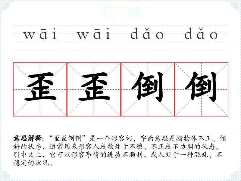 “歪歪倒倒”是一个形容词,字面意思是指物体不正、倾斜的状态,通常用来形容人或物处于不稳、不正或不协调的状态。引申义上,它可以形容事情的进展不顺利,或人处于一种混乱、不稳定的状况。