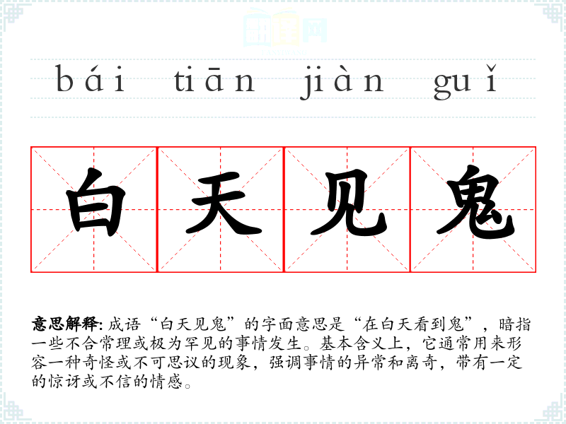 成语“白天见鬼”的字面意思是“在白天看到鬼”,暗指一些不合常理或极为罕见的事情发生。基本含义上,它通常用来形容一种奇怪或不可思议的现象,强调事情的异常和离奇,带有一定的惊讶或不信的情感。