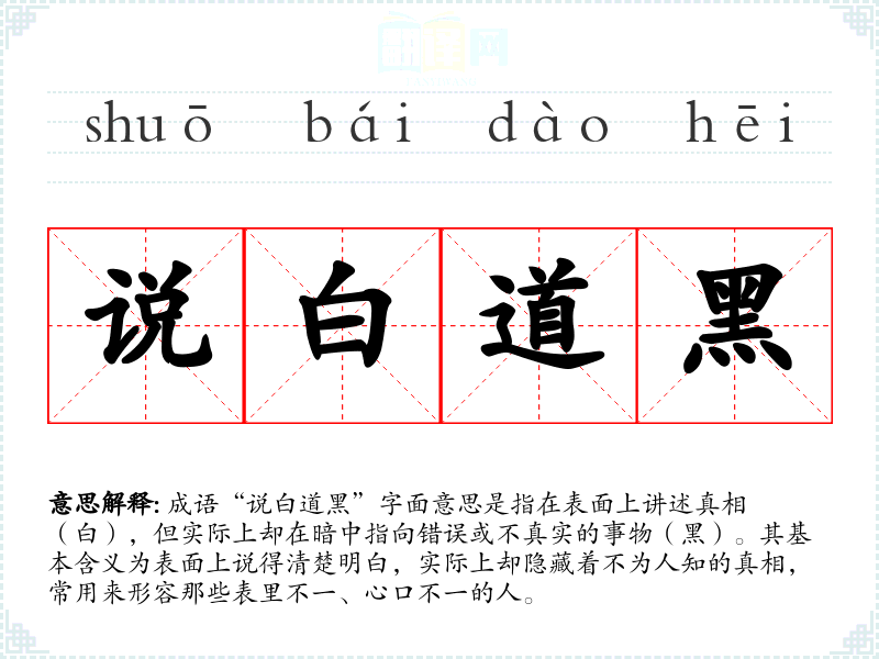 成语“说白道黑”字面意思是指在表面上讲述真相(白),但实际上却在暗中指向错误或不真实的事物(黑)。其基本含义为表面上说得清楚明白,实际上却隐藏着不为人知的真相,常用来形容那些表里不一、心口不一的人。