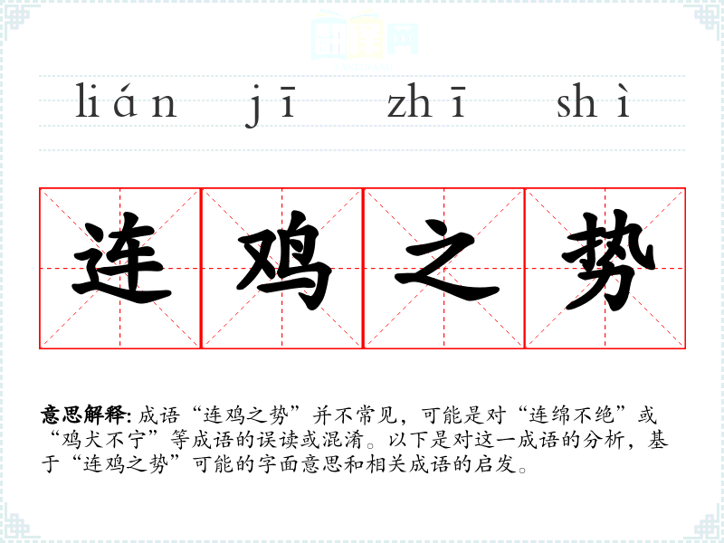 成语“连鸡之势”并不常见,可能是对“连绵不绝”或“鸡犬不宁”等成语的误读或混淆。以下是对这一成语的分析,基于“连鸡之势”可能的字面意思和相关成语的启发。