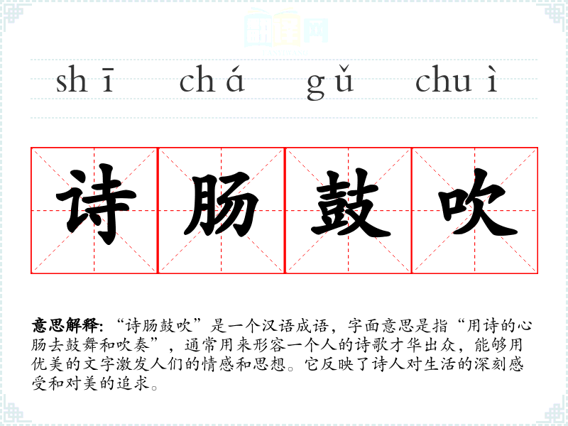 该成语的具体来源并没有明确的历史文献,但可以推测其与**古代诗歌的传统有关。在古代,诗歌不仅是一种文学形式,也是表达情感、思想的重要方式,因此“诗肠”可以理解为诗人的情感深度,而“鼓吹”则表示传播与宣扬。