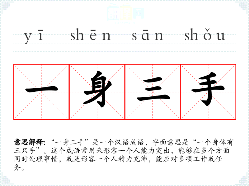 “一身三手”是一个汉语成语,字面意思是“一个身体有三只手”。这个成语常用来形容一个人能力突出,能够在多个方面同时处理事情,或是形容一个人精力充沛,能应对多项工作或任务。