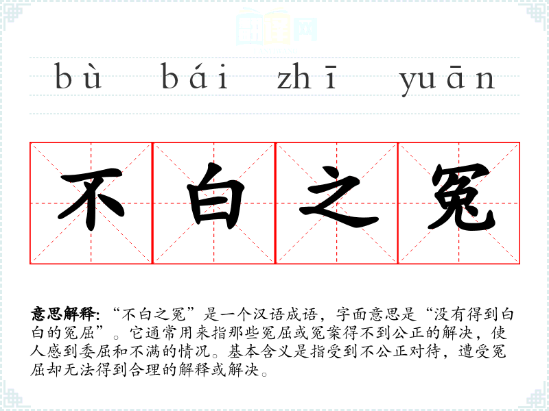 “不白之冤”是一个汉语成语,字面意思是“没有得到白白的冤屈”。它通常用来指那些冤屈或冤案得不到公正的解决,使人感到委屈和不满的情况。基本含义是指受到不公正对待,遭受冤屈却无法得到合理的解释或解决。