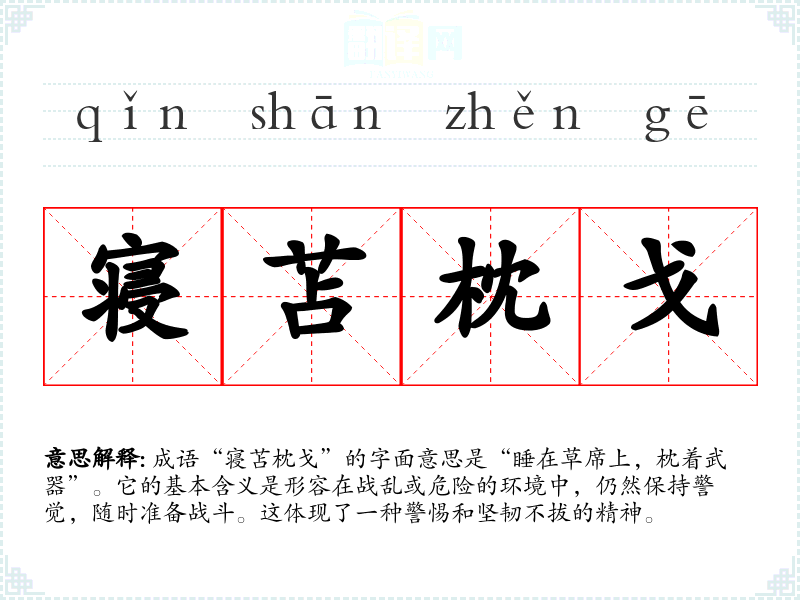 成语“寝苫枕戈”的字面意思是“睡在草席上,枕着武器”。它的基本含义是形容在战乱或危险的环境中,仍然保持警觉,随时准备战斗。这体现了一种警惕和坚韧不拔的精神。