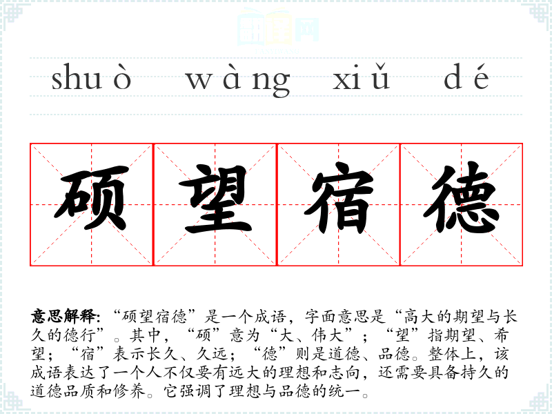 “硕望宿德”是一个成语,字面意思是“高大的期望与长久的德行”。其中,“硕”意为“大、伟大”;“望”指期望、希望;“宿”表示长久、久远;“德”则是道德、品德。整体上,该成语表达了一个人不仅要有远大的理想和志向,还需要具备持久的道德品质和修养。它强调了理想与品德的统一。