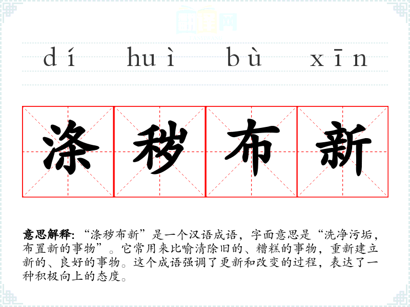 “涤秽布新”是一个汉语成语,字面意思是“洗净污垢,布置新的事物”。它常用来比喻清除旧的、糟糕的事物,重新建立新的、良好的事物。这个成语强调了更新和改变的过程,表达了一种积极向上的态度。