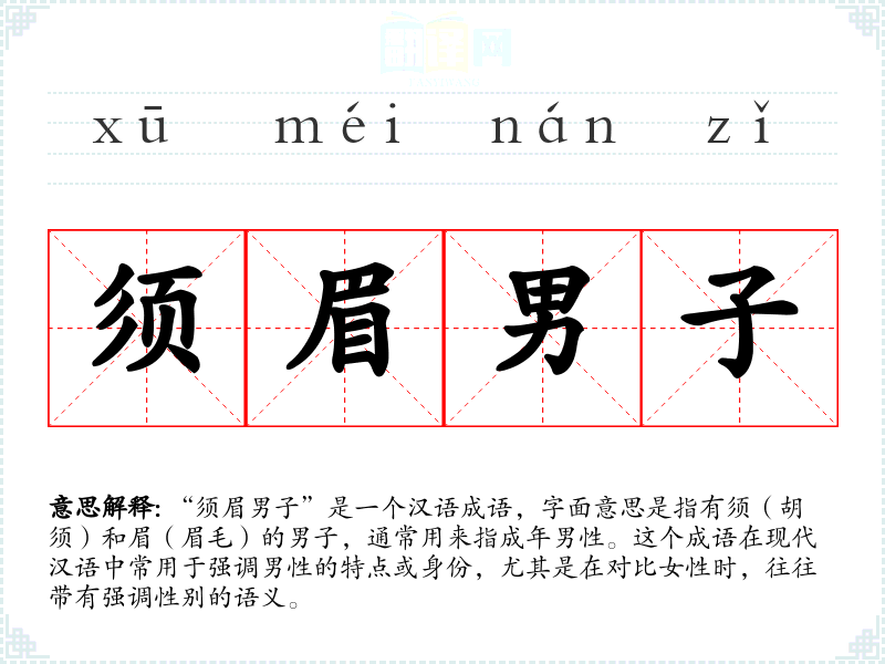 “须眉男子”是一个汉语成语,字面意思是指有须(胡须)和眉(眉毛)的男子,通常用来指成年男性。这个成语在现代汉语中常用于强调男性的特点或身份,尤其是在对比女性时,往往带有强调性别的语义。