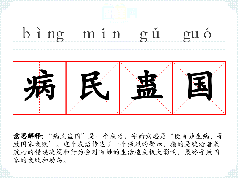 “病民蛊国”是一个成语,字面意思是“使百姓生病,导致国家衰败”。这个成语传达了一个强烈的警示,指的是统治者或政府的错误决策和行为会对百姓的生活造成极大影响,最终导致国家的衰败和动荡。