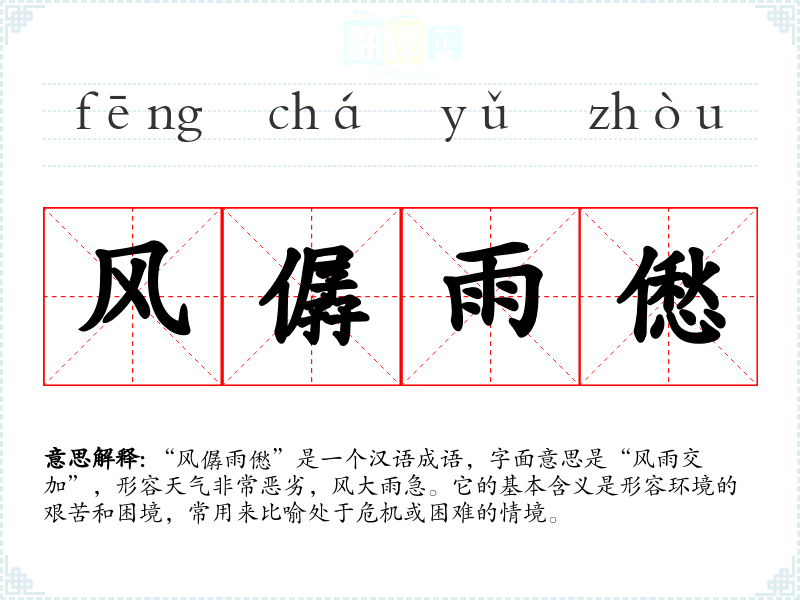 “风僝雨僽”是一个汉语成语,字面意思是“风雨交加”,形容天气非常恶劣,风大雨急。它的基本含义是形容环境的艰苦和困境,常用来比喻处于危机或困难的情境。