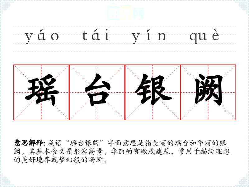 成语“瑶台银阙”字面意思是指美丽的瑶台和华丽的银阙。其基本含义是形容高贵、华丽的宫殿或建筑,常用于描绘理想的美好境界或梦幻般的场所。