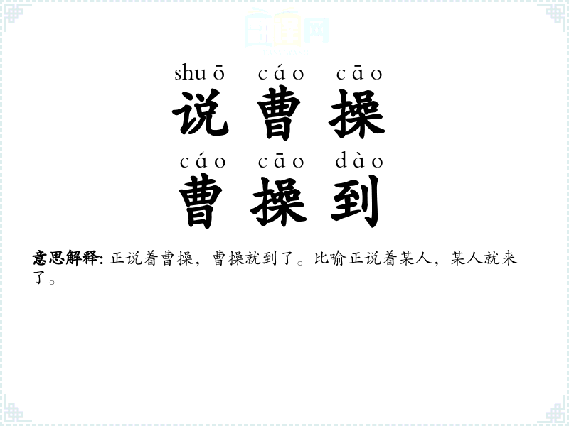 | 说曹操,曹操到 | 正说着曹操,曹操就到了。比喻正说着某人,某人就来了。 |