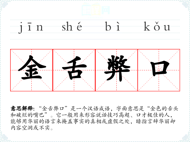 “金舌弊口”是一个汉语成语,字面意思是“金色的舌头和破烂的嘴巴”。它一般用来形容说话技巧高超、口才极佳的人,能够用华丽的语言来掩盖事实的真相或虚假之处,暗指言辞华丽却内容空洞或不实。