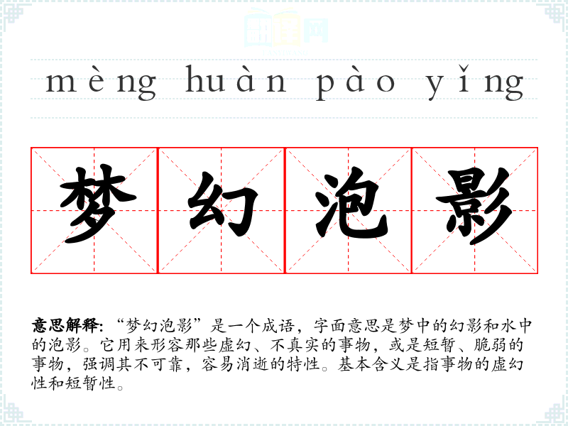 “梦幻泡影”最早见于《大乘起信论》,原文为“如梦如幻,如泡如影”,用来形容世间一切现象的虚幻和无常。这个成语蕴含了**的思想,尤其是对世间一切事物的看破和无常的理解,反映出一种超脱的哲学观。