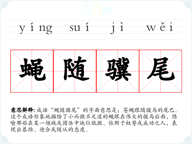成语“蝇随骥尾”的字面意思是:苍蝇跟随骏马的尾巴。这个成语形象地描绘了小而微不足道的蝇跟在伟大的骏马后面,隐喻那些在某一领域或团体中地位低微、依附于权势或成功之人,表现出恭维、迎合或随从的态度。
