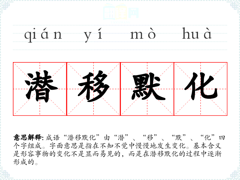 成语“潜移默化”由“潜”、“移”、“默”、“化”四个字组成。字面意思是指在不知不觉中慢慢地发生变化。基本含义是形容事物的变化不是显而易见的,而是在潜移默化的过程中逐渐形成的。