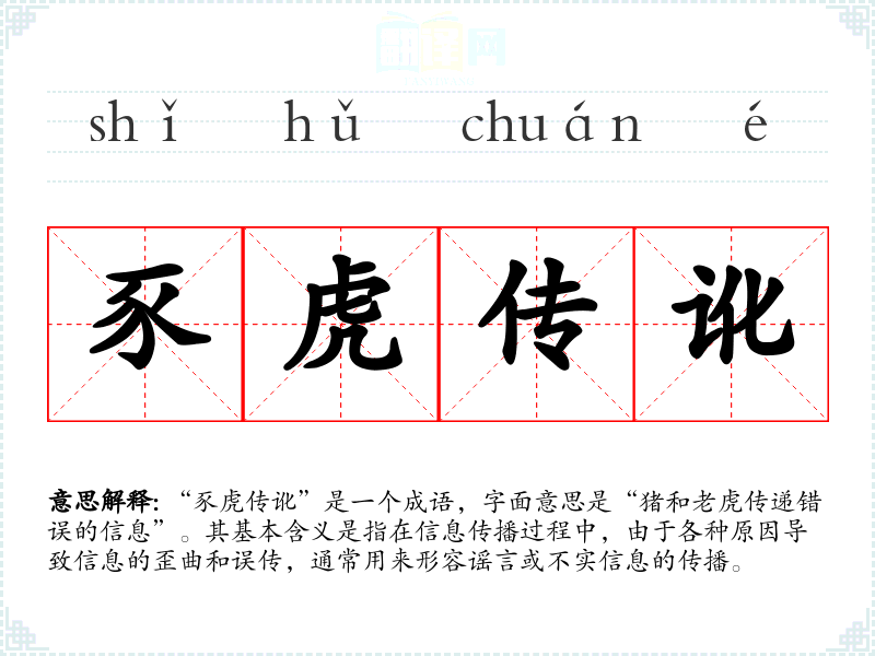 “豕虎传讹”是一个成语,字面意思是“猪和**传递错误的信息”。其基本含义是指在信息传播过程中,由于各种原因导致信息的歪曲和误传,通常用来形容谣言或不实信息的传播。