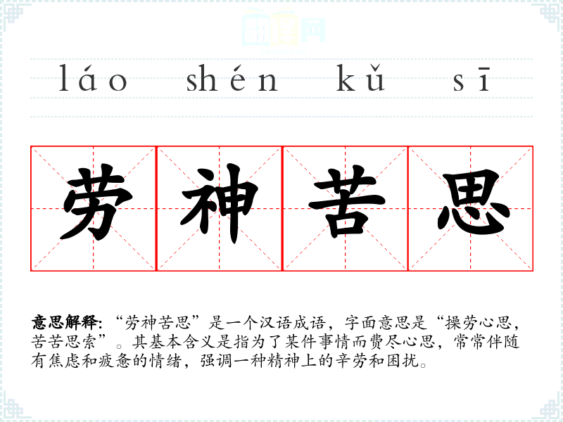 “劳神苦思”是一个汉语成语,字面意思是“操劳心思,苦苦思索”。其基本含义是指为了某件事情而费尽心思,常常伴随有焦虑和疲惫的情绪,强调一种精神上的辛劳和困扰。