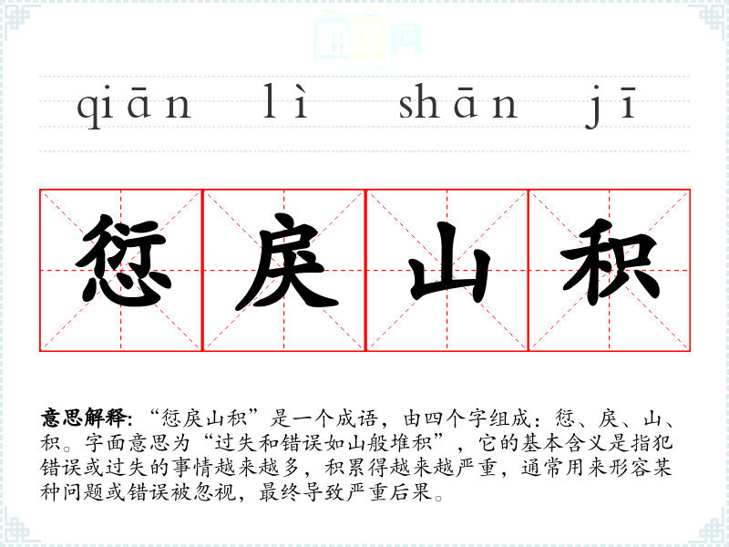 “愆戾山积”是一个成语,由四个字组成:愆、戾、山、积。字面意思为“过失和错误如山般堆积”,它的基本含义是指犯错误或过失的事情越来越多,积累得越来越严重,通常用来形容某种问题或错误被忽视,最终导致严重后果。