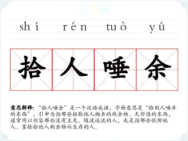 “拾人唾余”是一个汉语成语,字面意思是“捡别人唾弃的东西”,引申为指那些拾取他人抛弃的残余物、无价值的东西,通常用以形容那些没有主见、随波逐流的人,或是指那些依附他人、靠捡拾他人剩余物而生存的人。