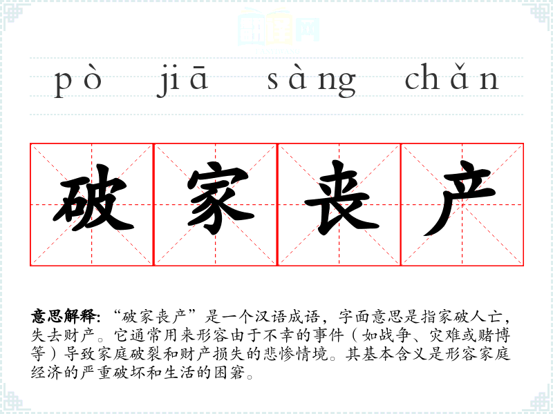 该成语的具体来源并没有明确的历史典故,但它反映了古代社会对家庭和财产的重要性的认识。在**传统文化中,家庭是社会的基本单位,家破人亡的情形常常被视为一种悲剧。成语中的“破家”和“丧产”二词,分别强调了家庭的解体和财产的丧失,合在一起更是加深了其悲惨的意味。