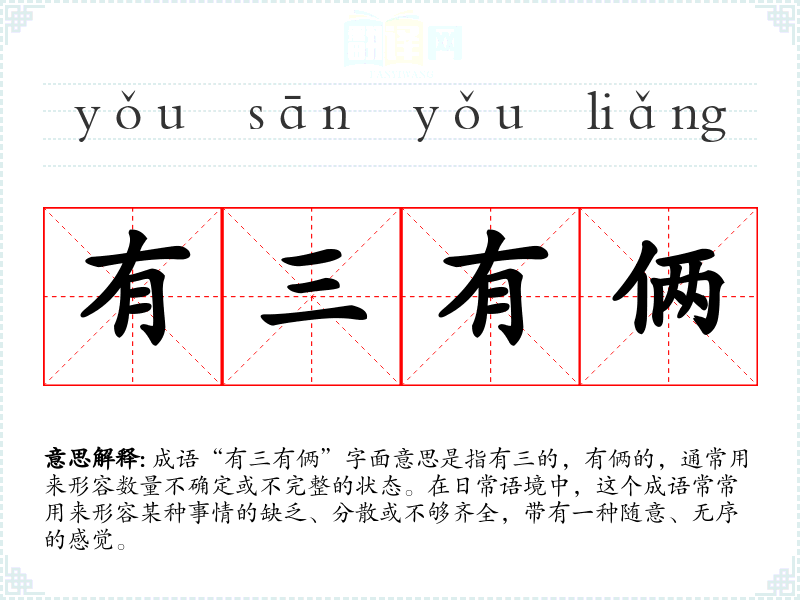 成语“有三有俩”字面意思是指有三的,有俩的,通常用来形容数量不确定或不完整的状态。在日常语境中,这个成语常常用来形容某种事情的缺乏、分散或不够齐全,带有一种随意、无序的感觉。