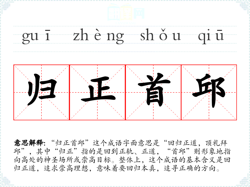 “归正首邱”这个成语字面意思是“回归正道,顶礼拜邱”,其中“归正”指的是回到正轨、正道,“首邱”则形象地指向高处的神圣场所或崇高目标。整体上,这个成语的基本含义是回归正道,追求崇高理想,意味着要回归本真,追寻正确的方向。