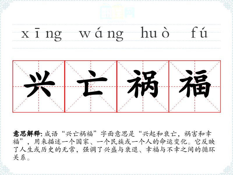 成语“兴亡祸福”字面意思是“兴起和衰亡,祸害和幸福”,用来描述一个国家、一个民族或一个人的命运变化。它反映了人生或历史的无常,强调了兴盛与衰退、幸福与不幸之间的循环关系。