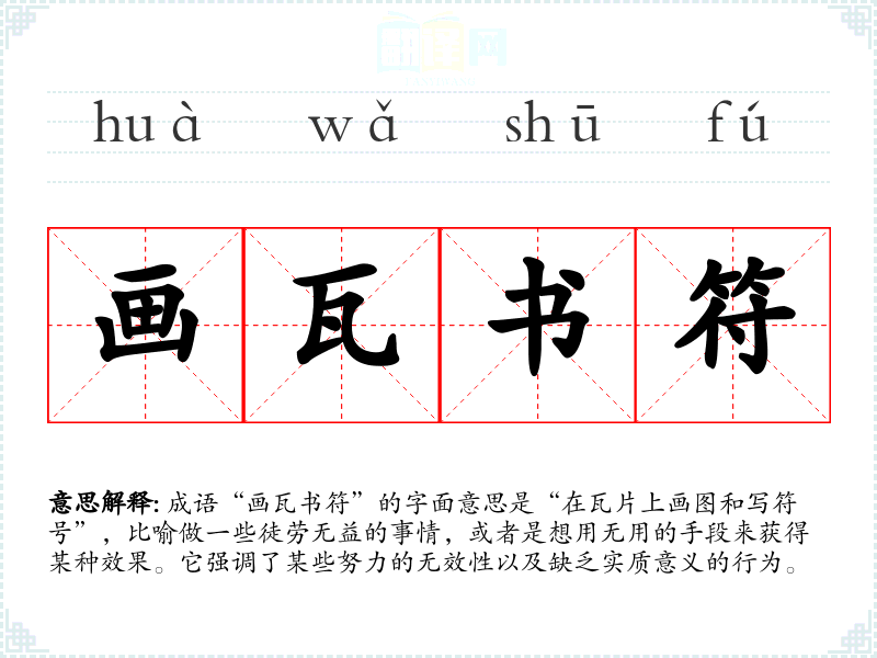 成语“画瓦书符”的字面意思是“在瓦片上画图和写符号”,比喻做一些徒劳无益的事情,或者是想用无用的手段来获得某种效果。它强调了某些努力的无效性以及缺乏实质意义的行为。